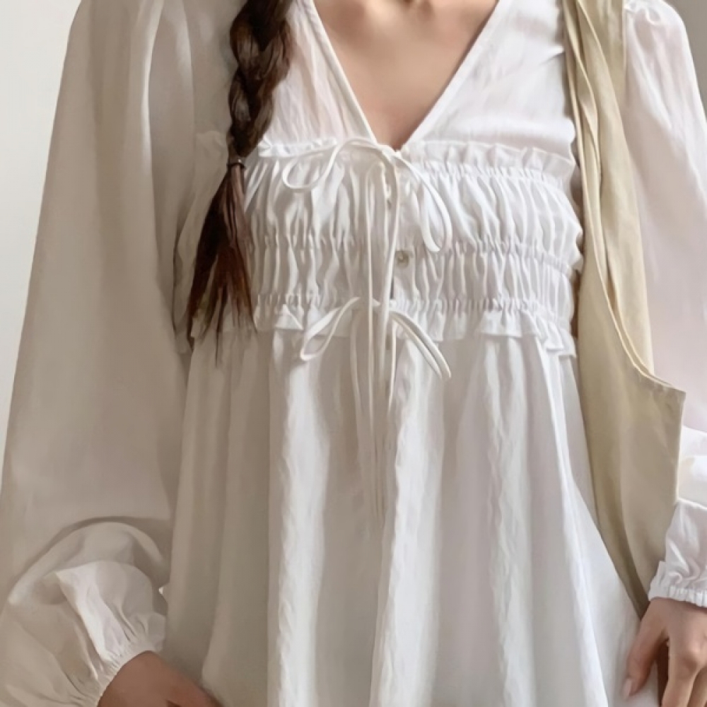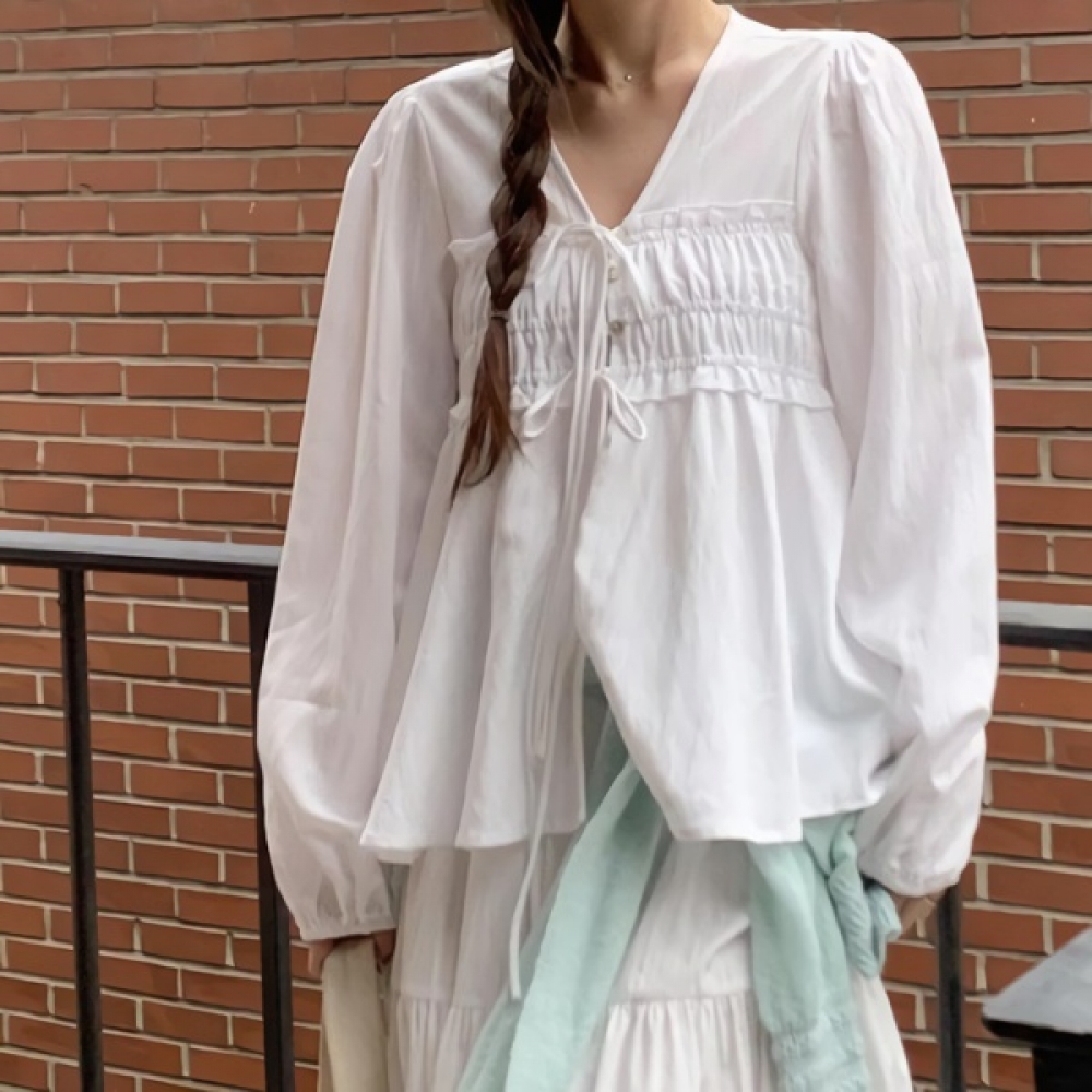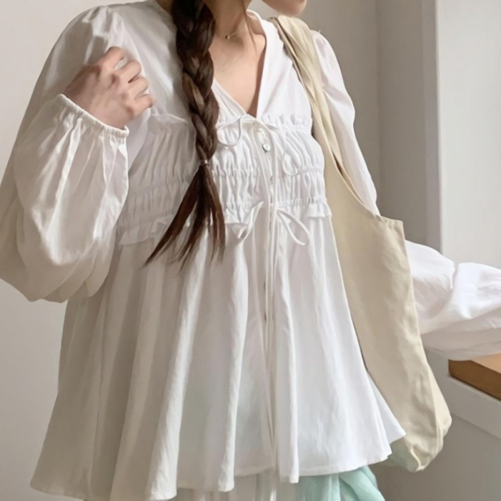 여성 코튼 러플 브이넥 리본 퍼프 블라우스
