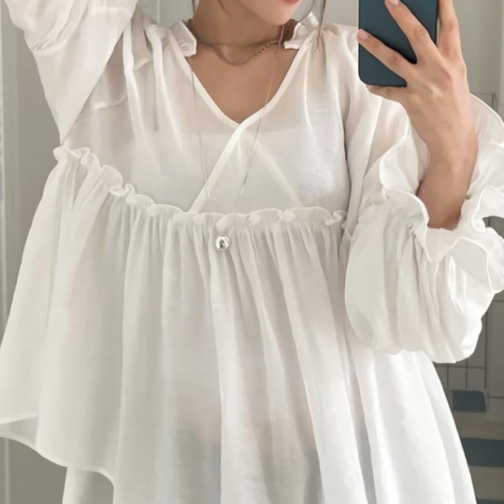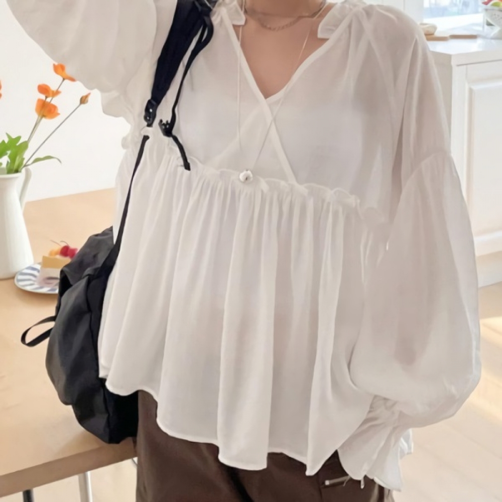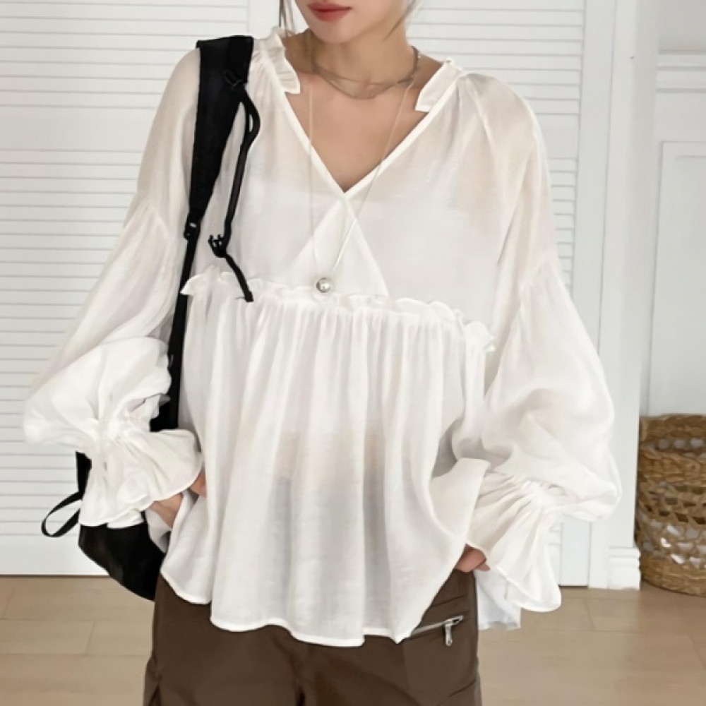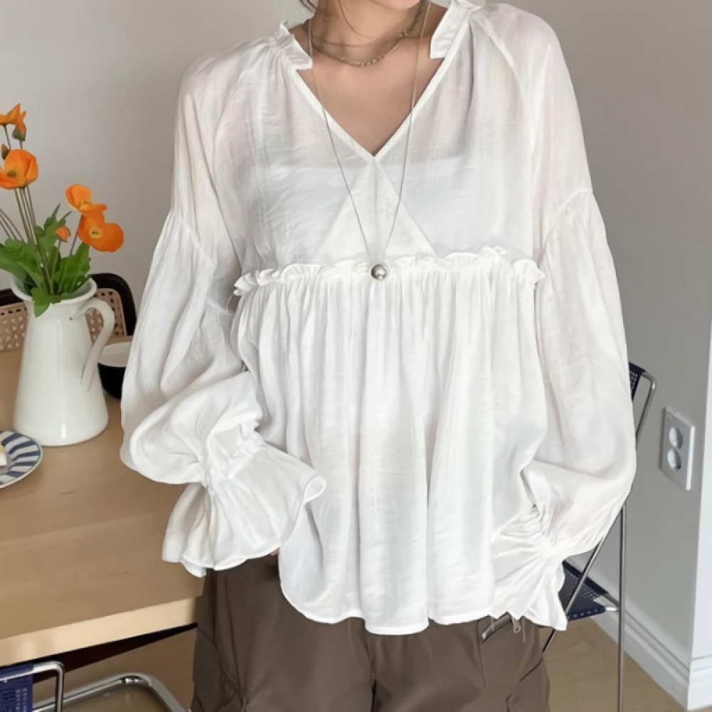 여성 코튼 러플 브이넥 리본 퍼프 블라우스