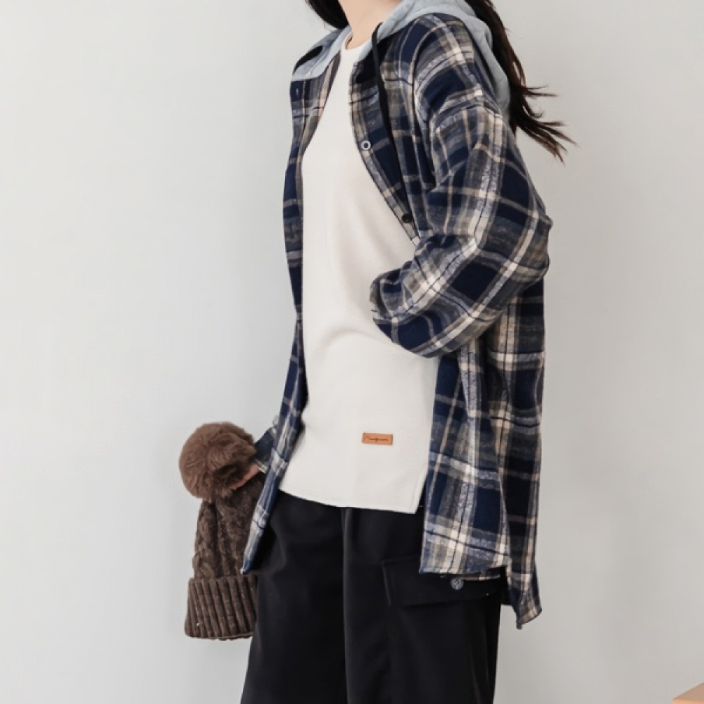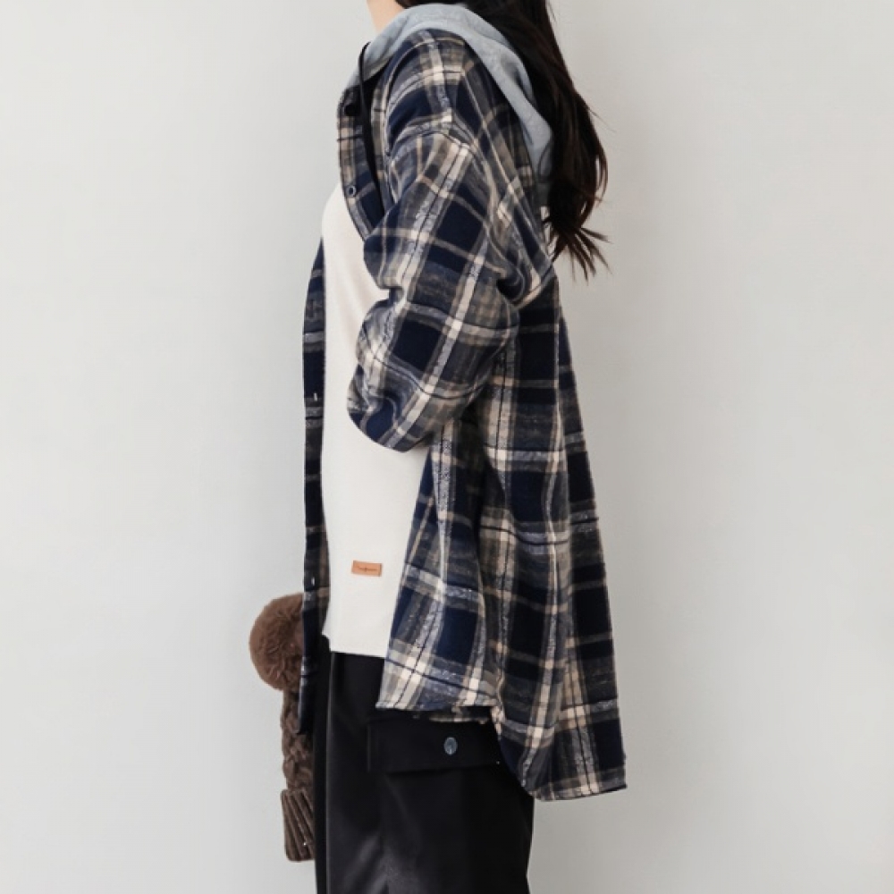 여성 오버핏 실버 펜던트 포켓 체크 셔츠