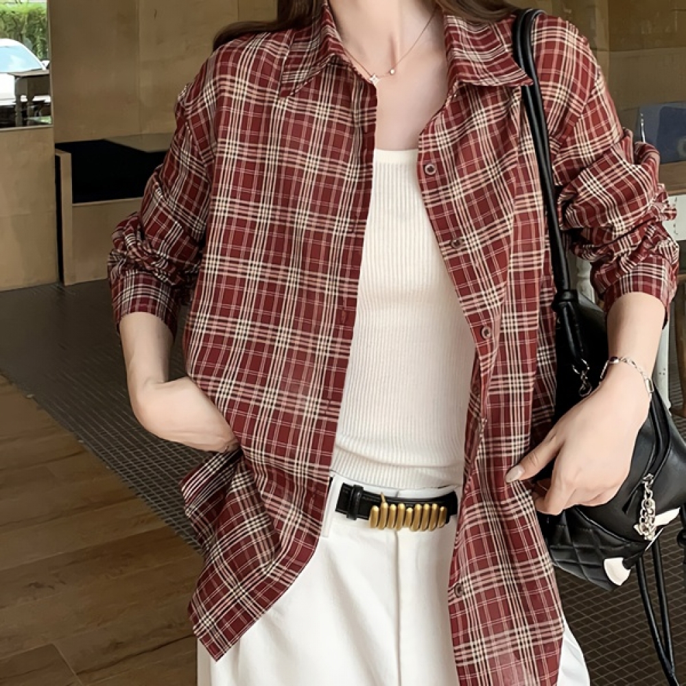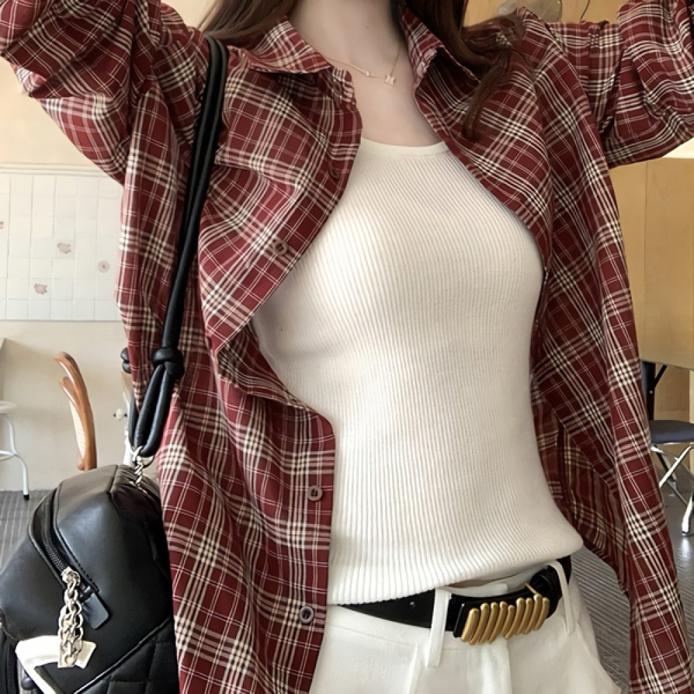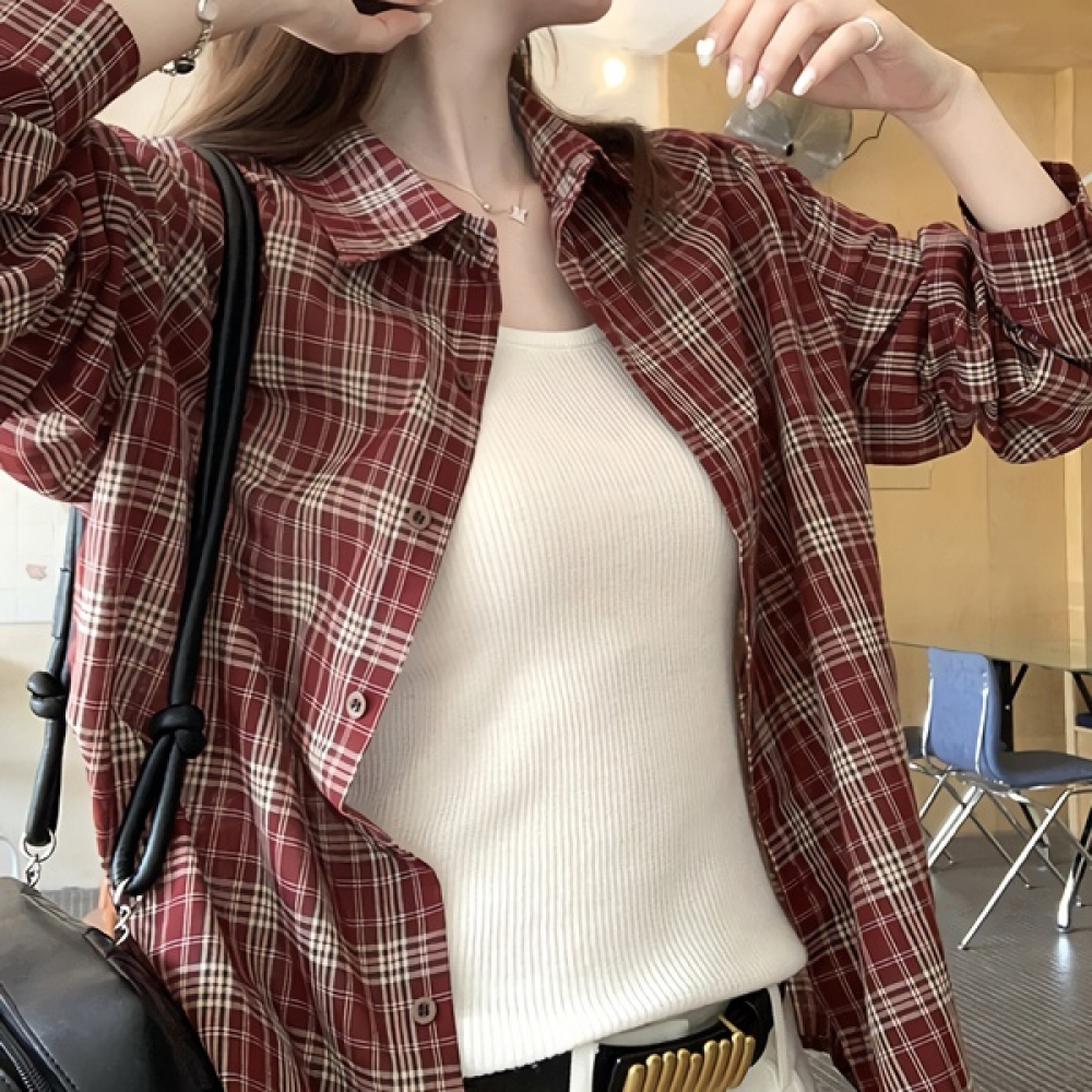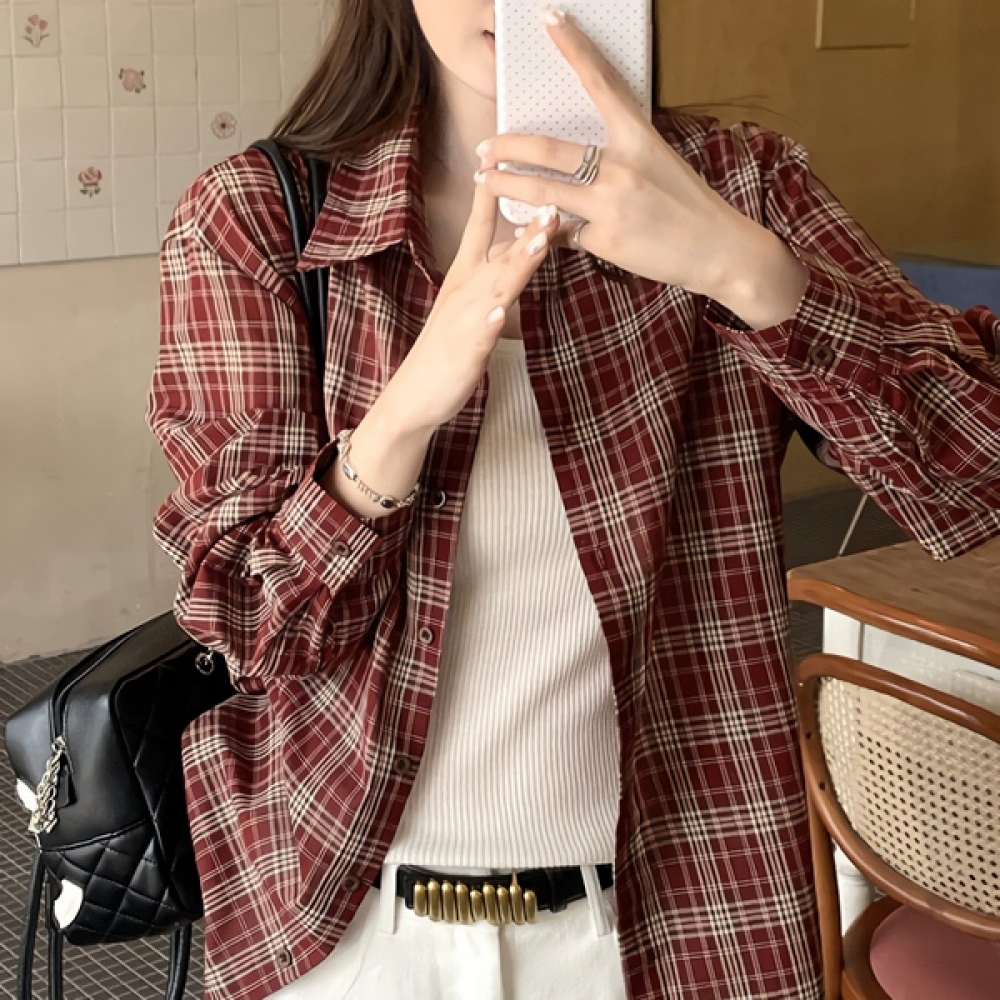 여성 봄 여름 빈티지 레드 체크 셔츠