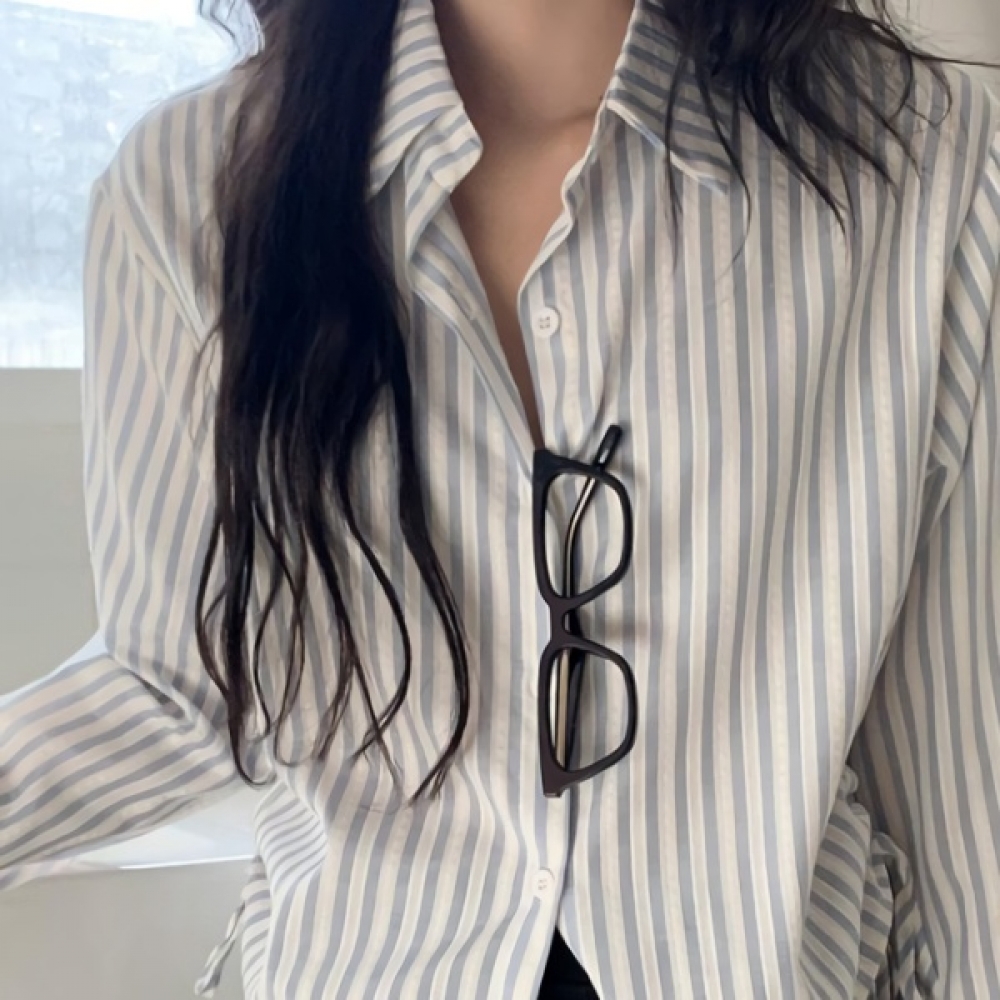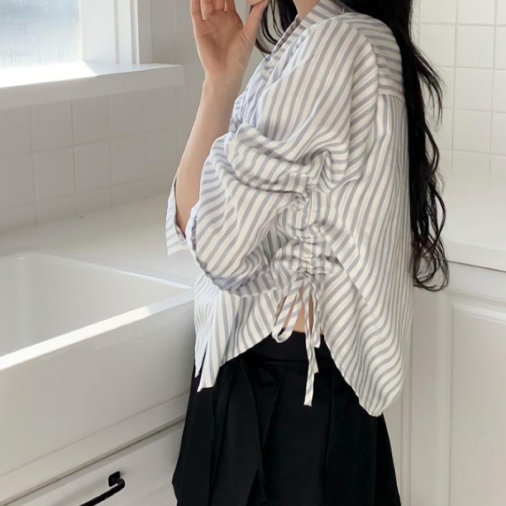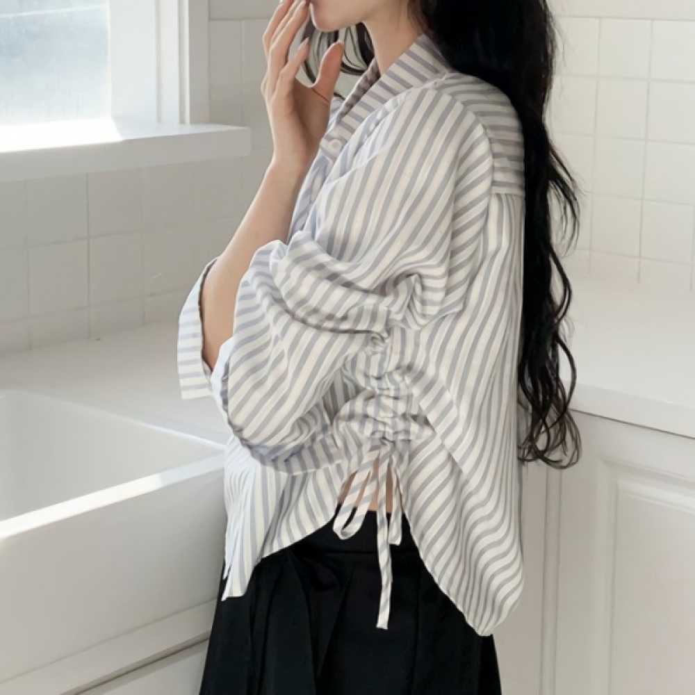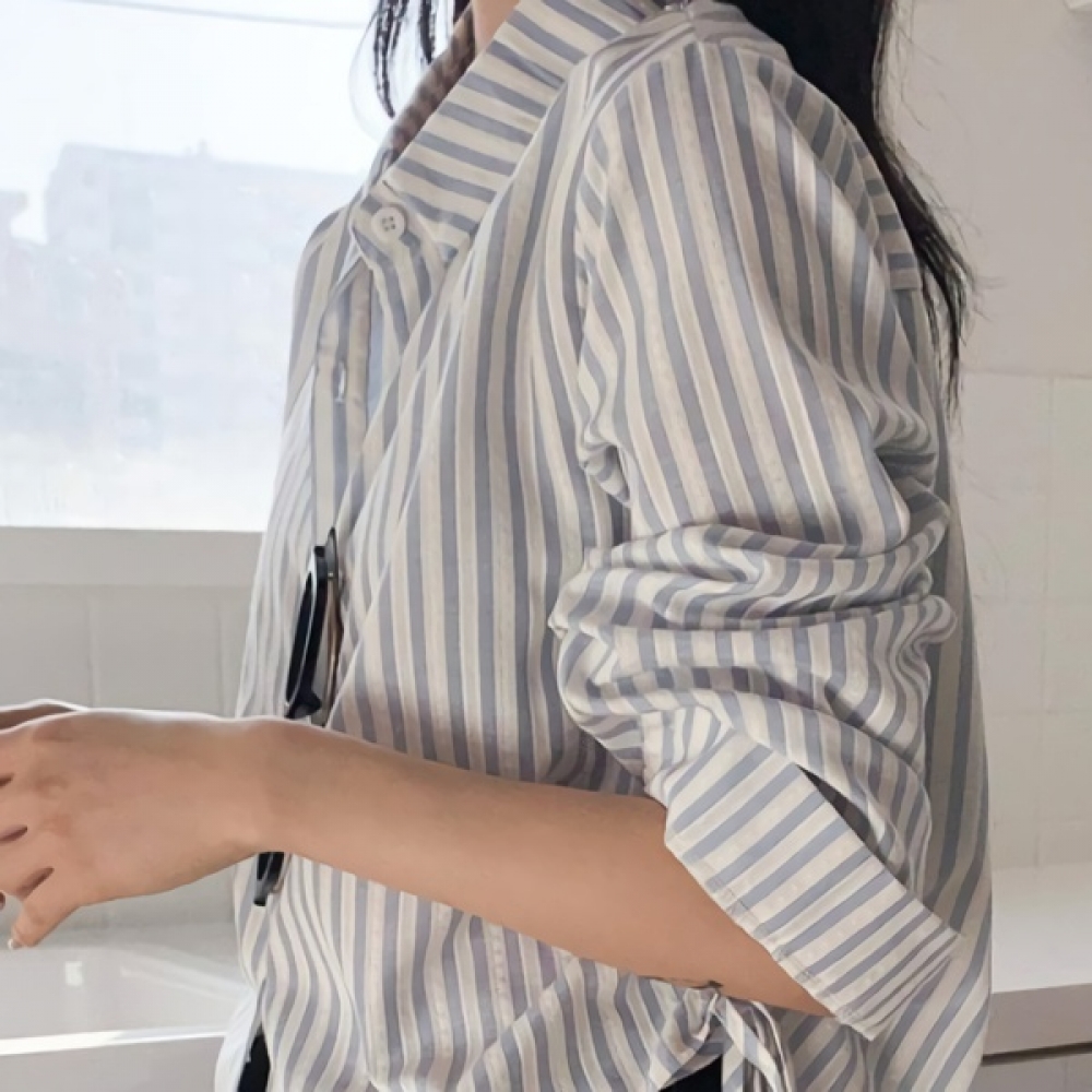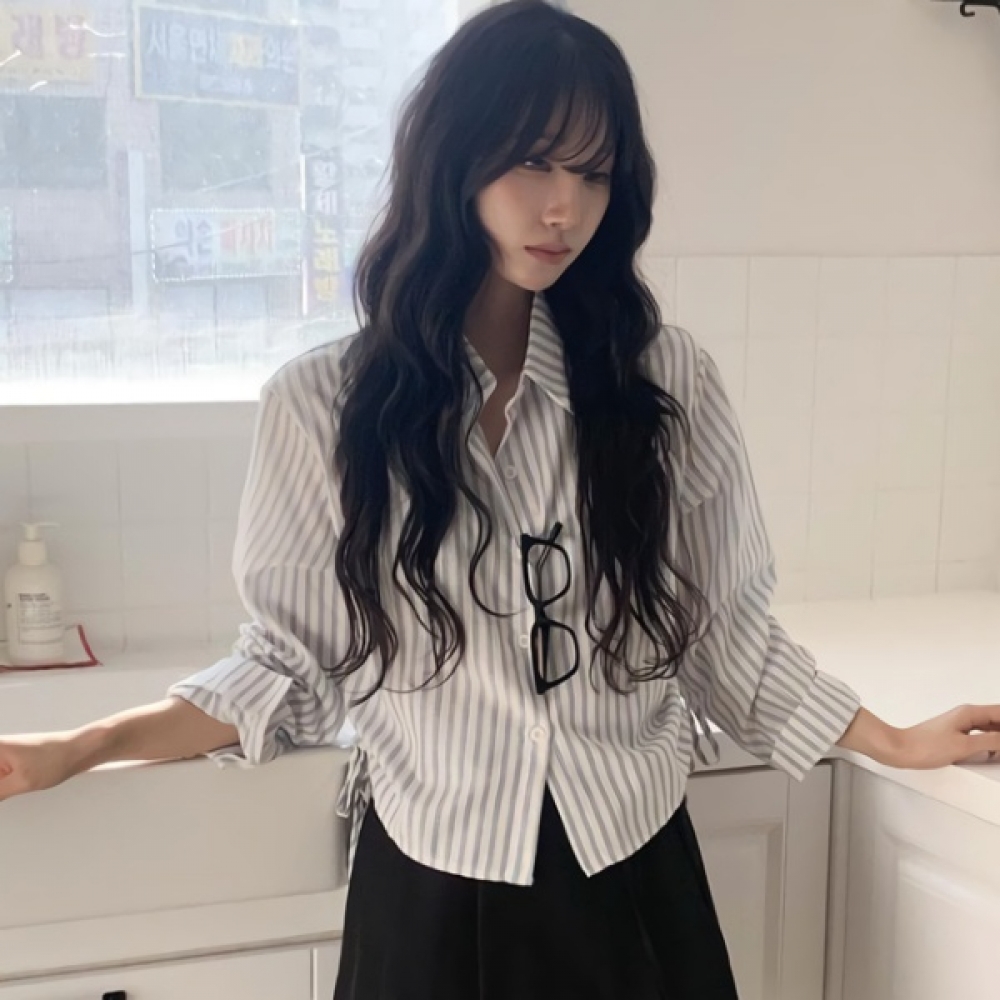 여성 세미크롭 스트라이프 코튼 카라 셔츠