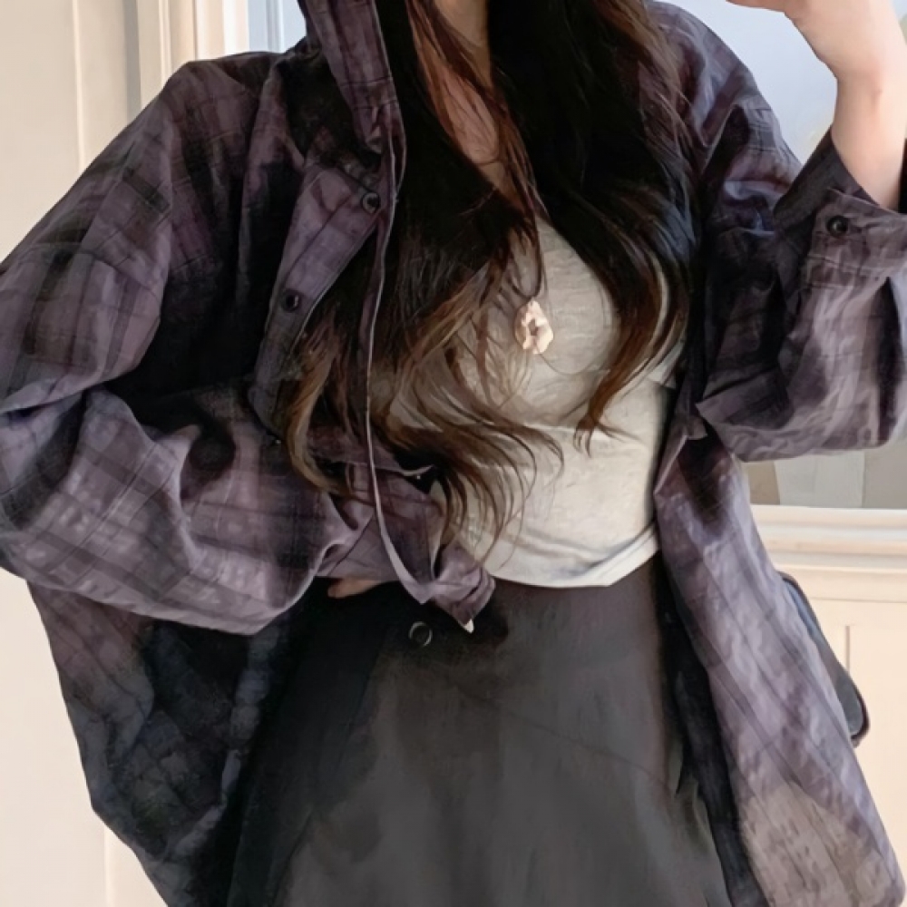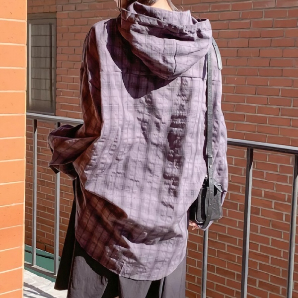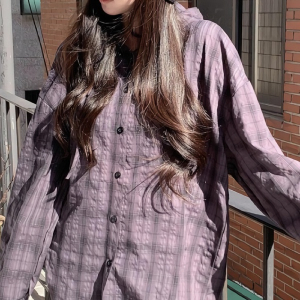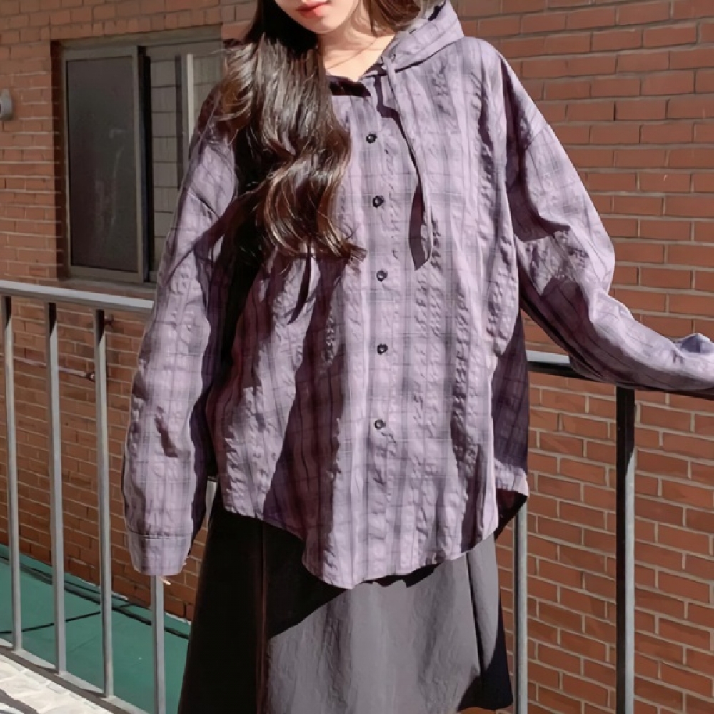 여성 봄 루즈핏 클래식 체크 후드 셔츠