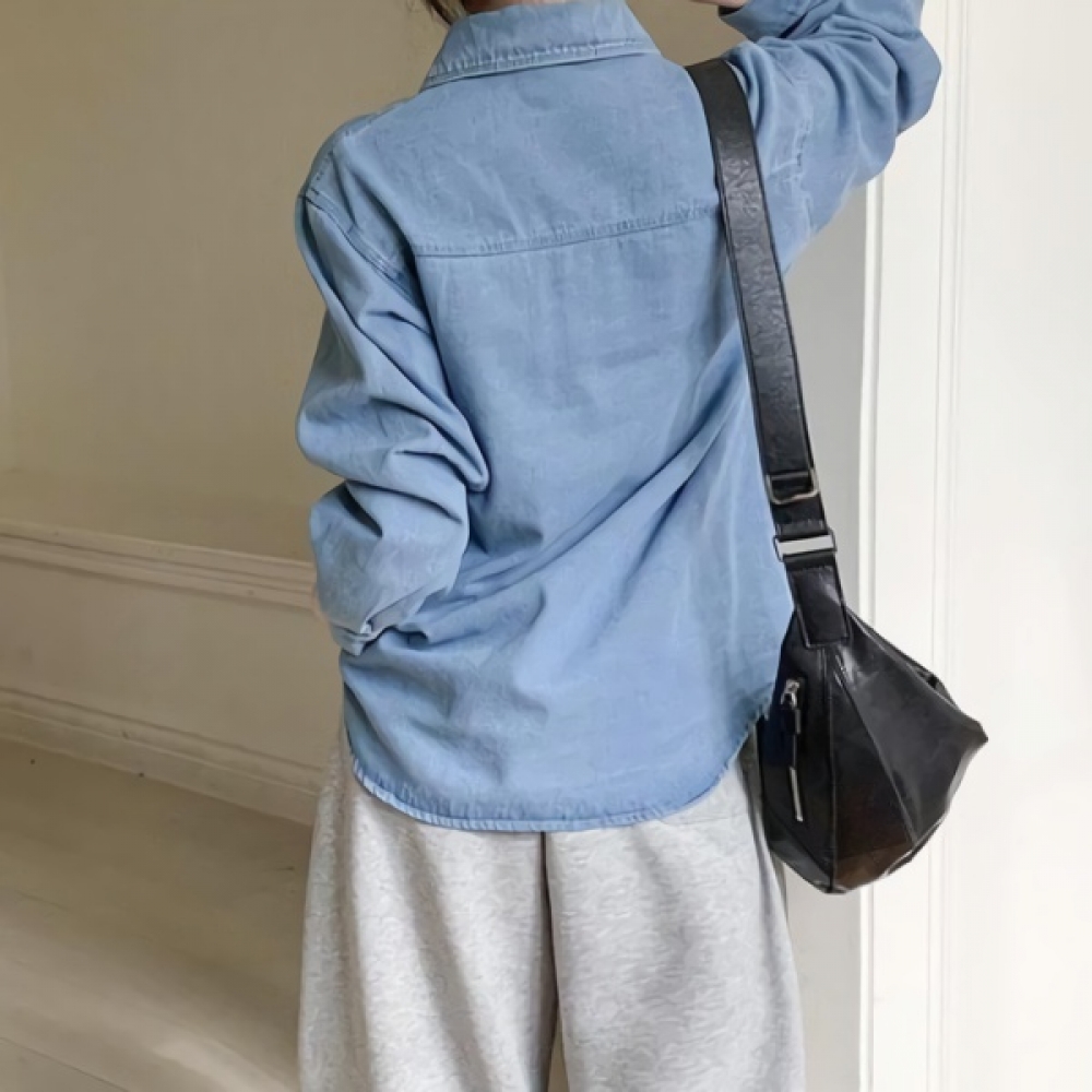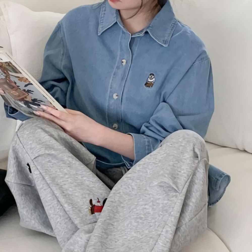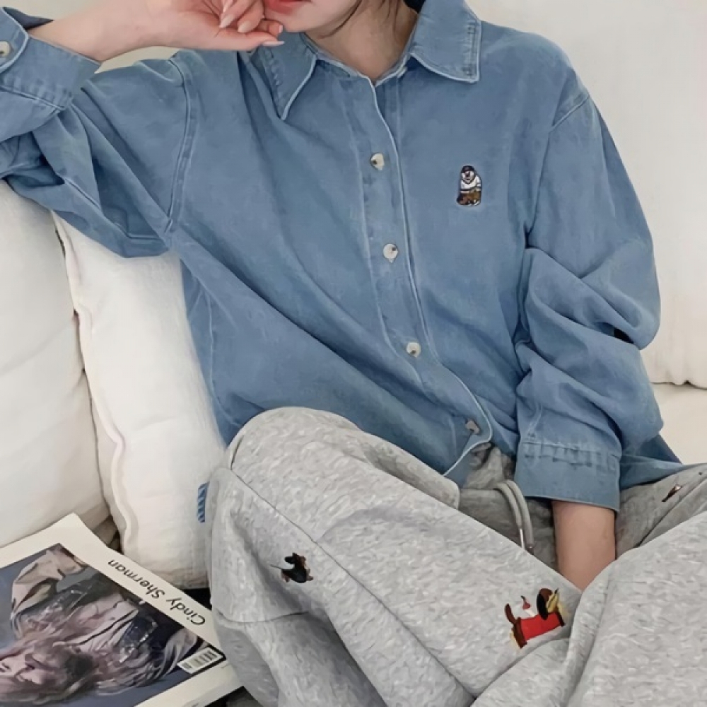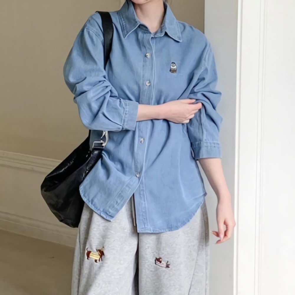 여성 봄 베어 자수 루즈핏 데님 셔츠