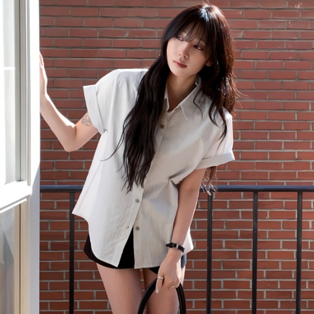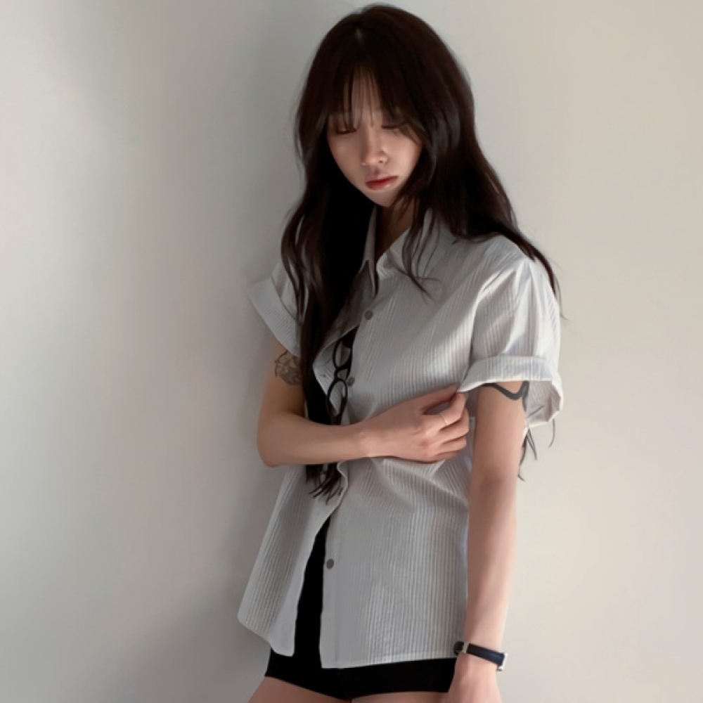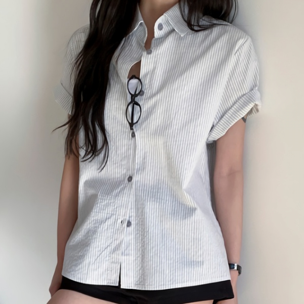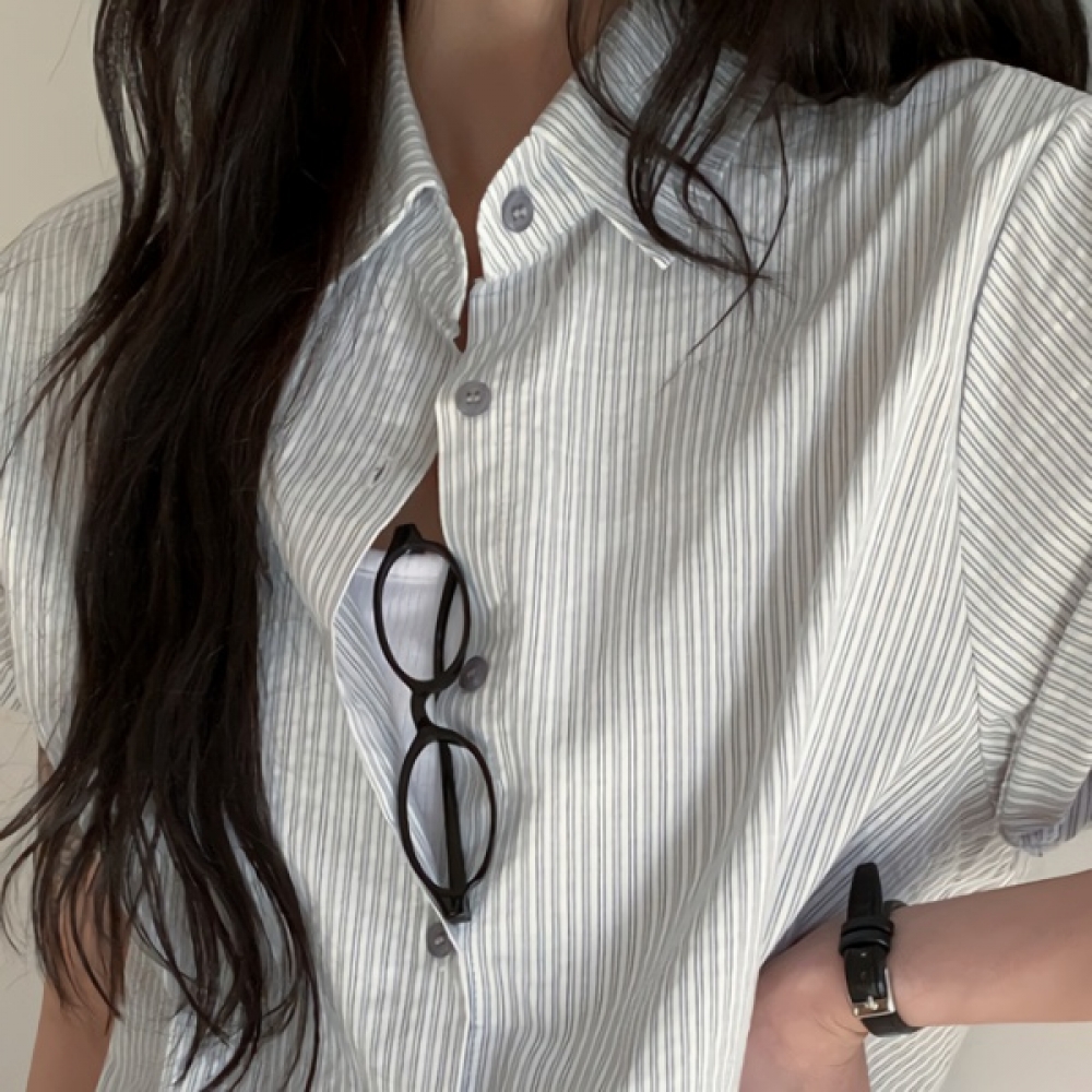 여성 스트라이프 오버핏 카라 반팔 셔츠