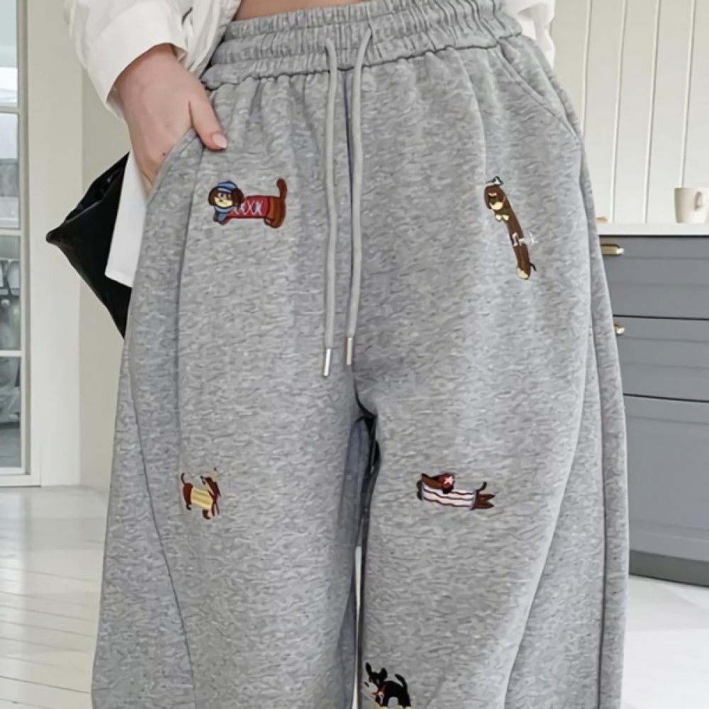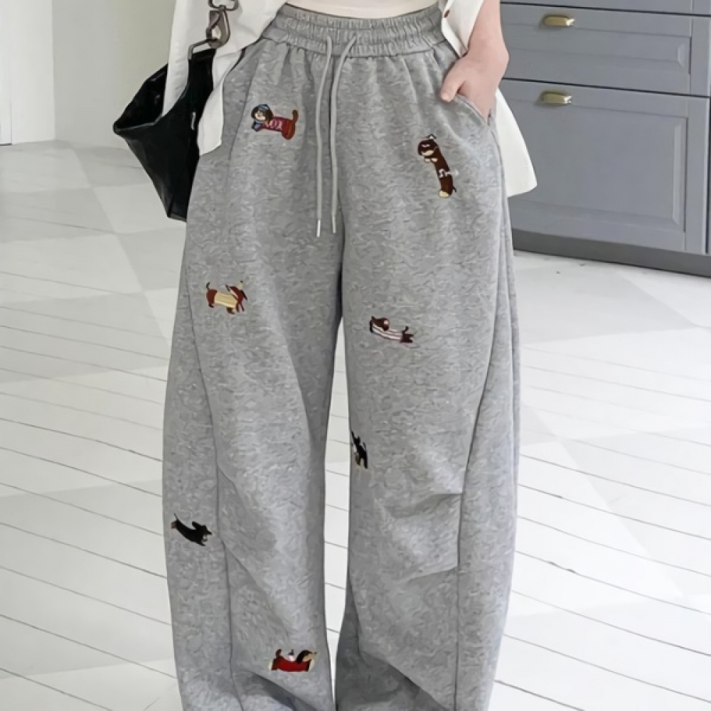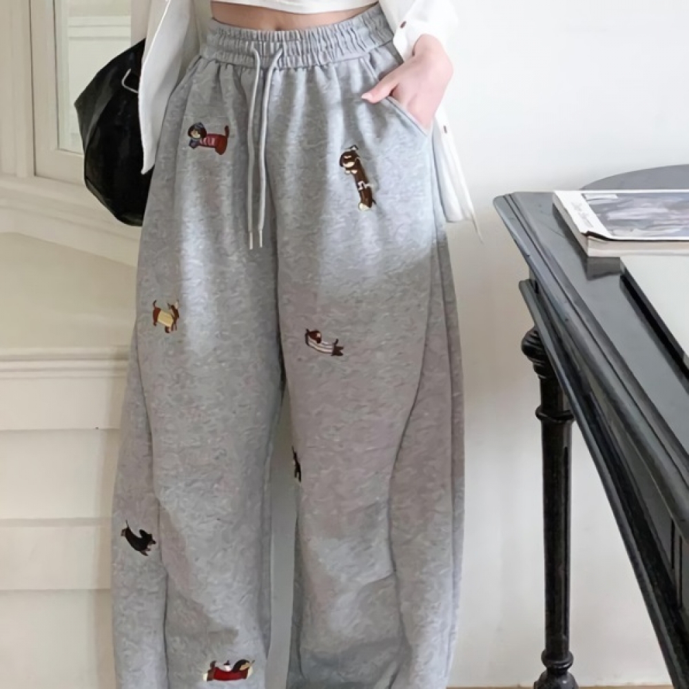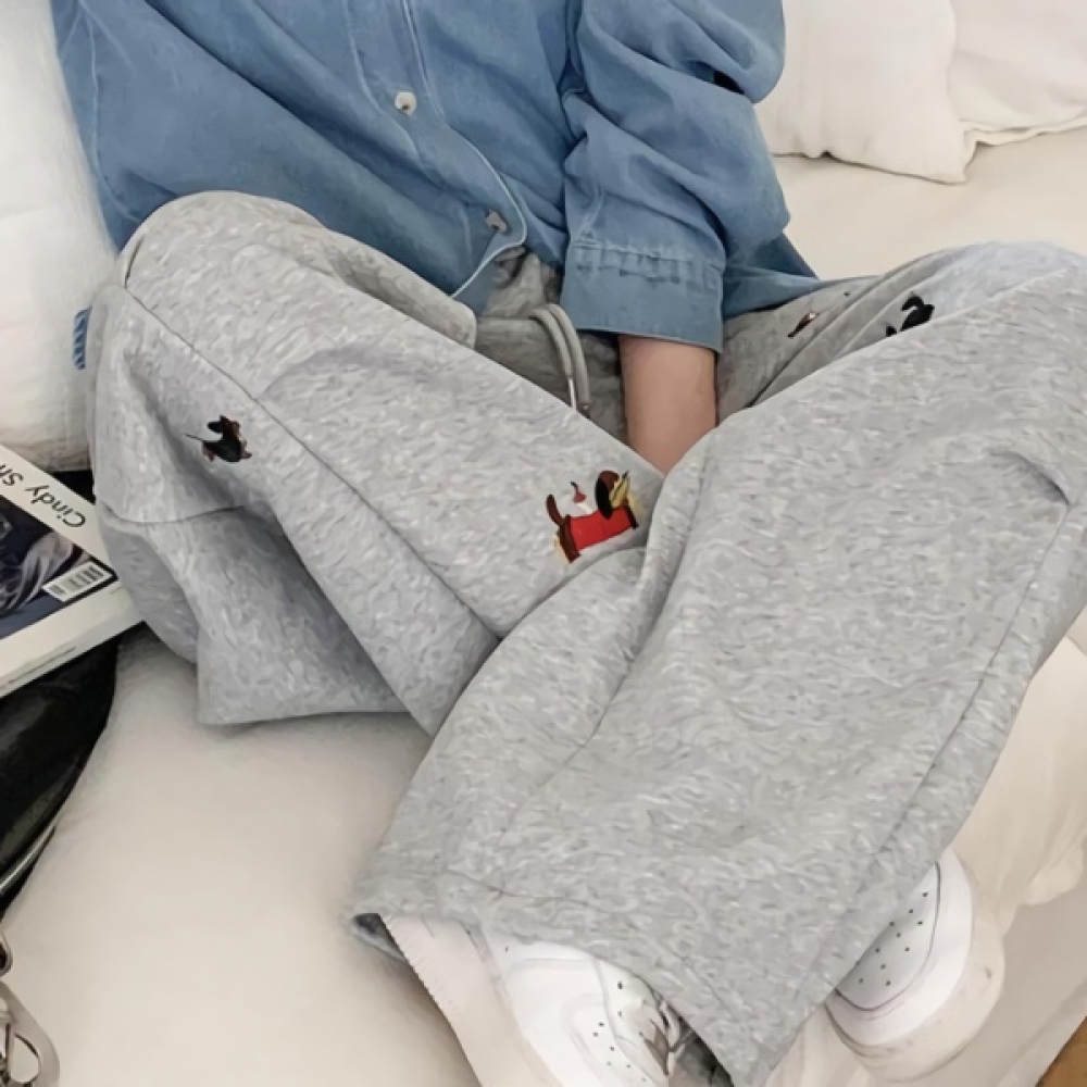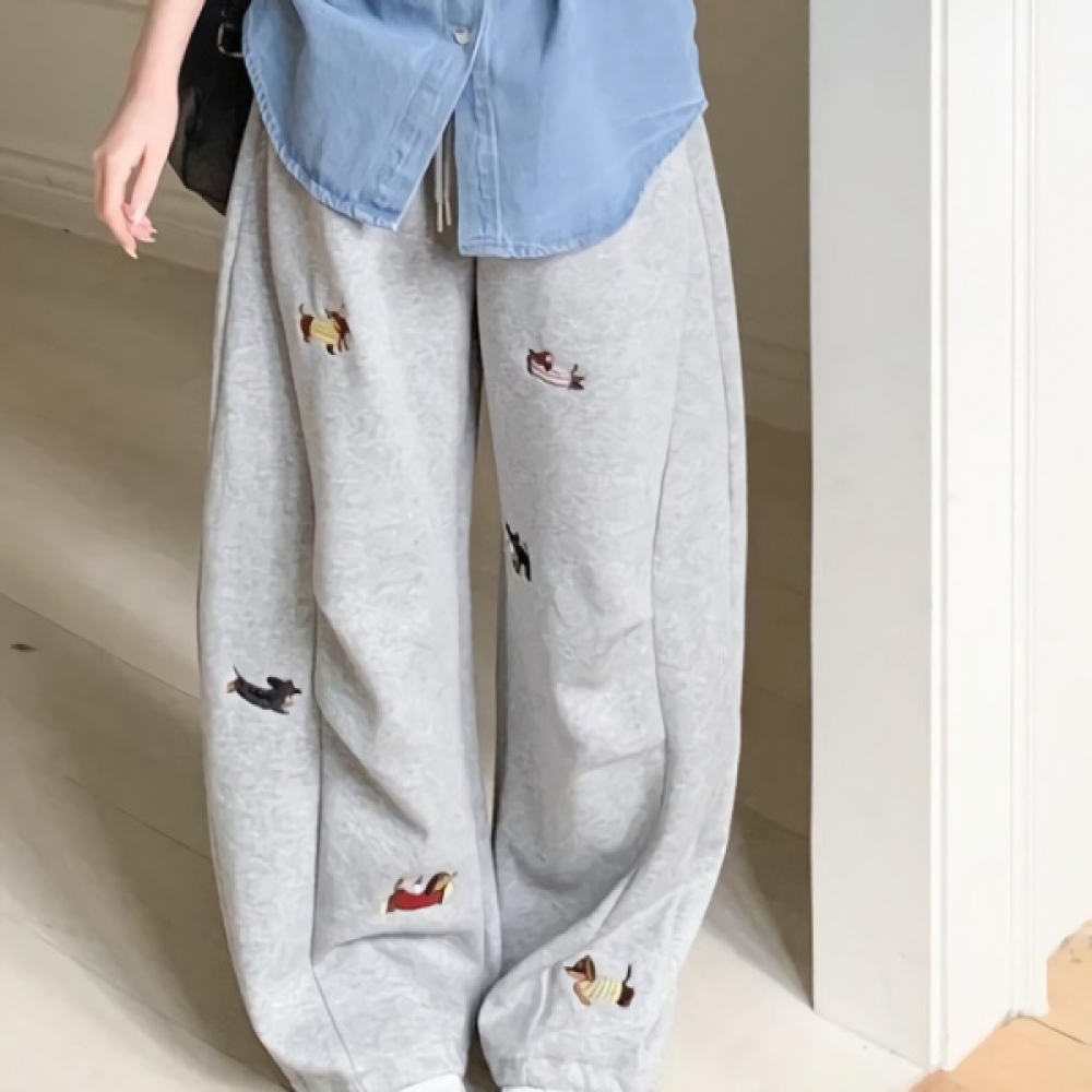 여성 닥스훈트 자수 밴딩 와이드 팬츠