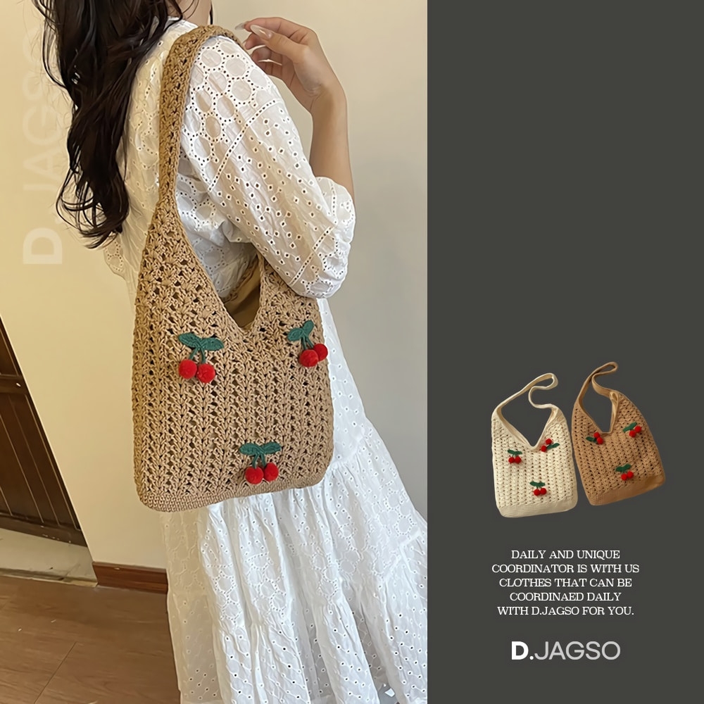 여성 귀여운 앵두 체리 포인트 베이지 니트백