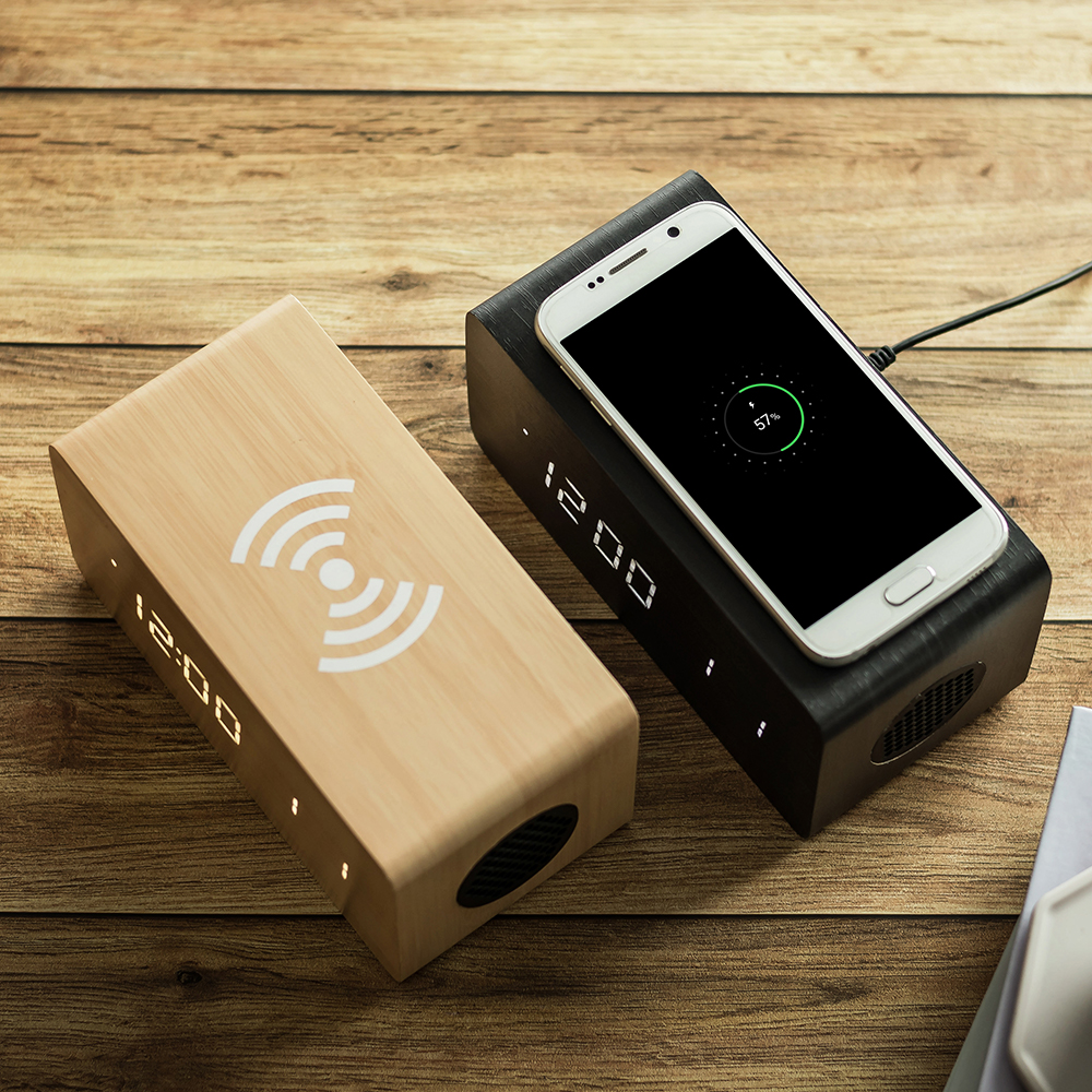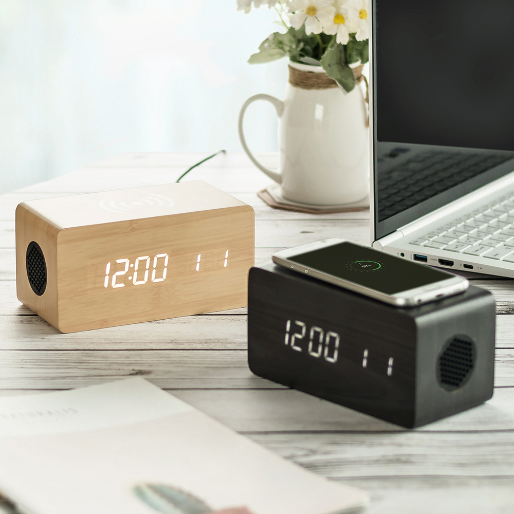 우드 3in1 무선충전 블루투스 스피커 LED 탁상시계